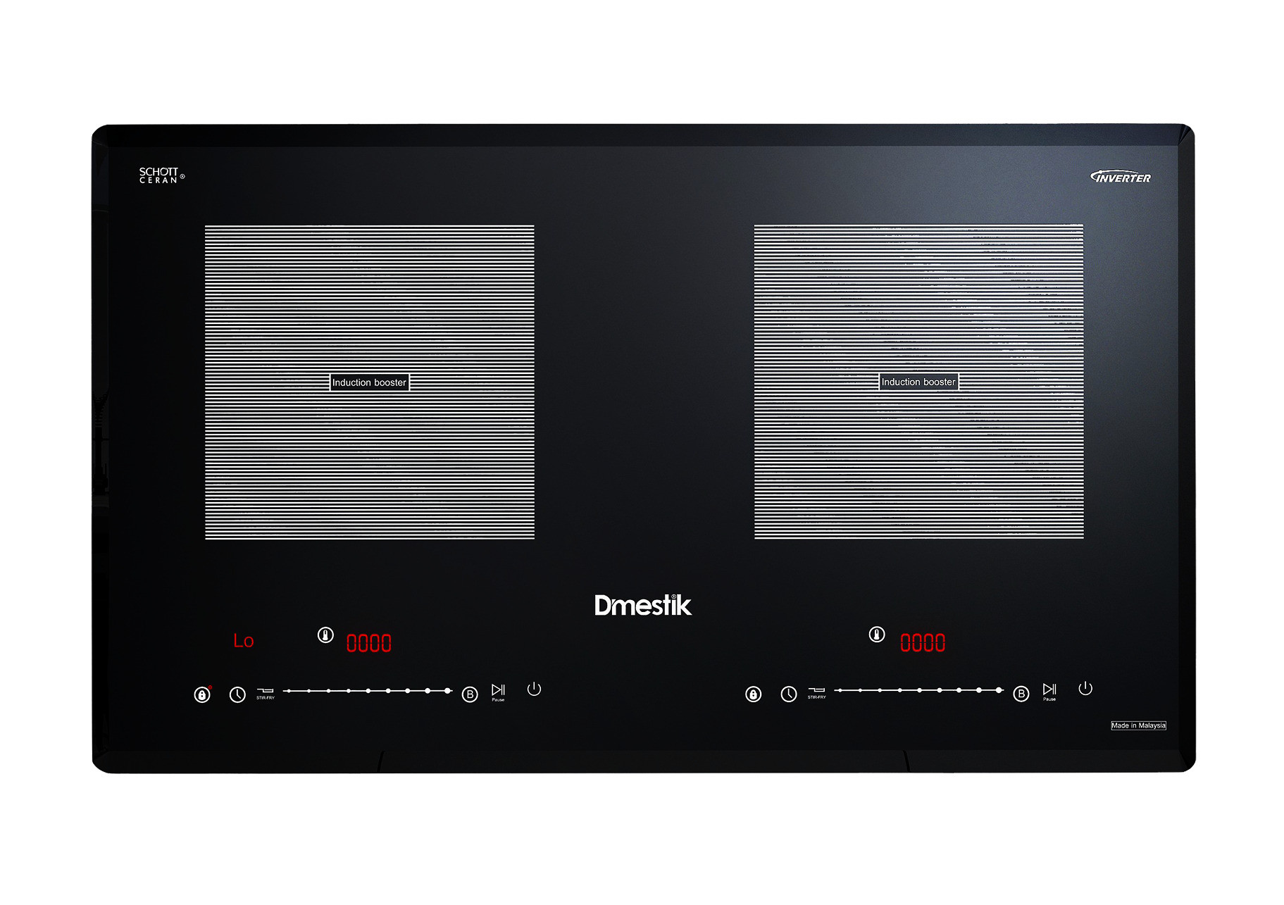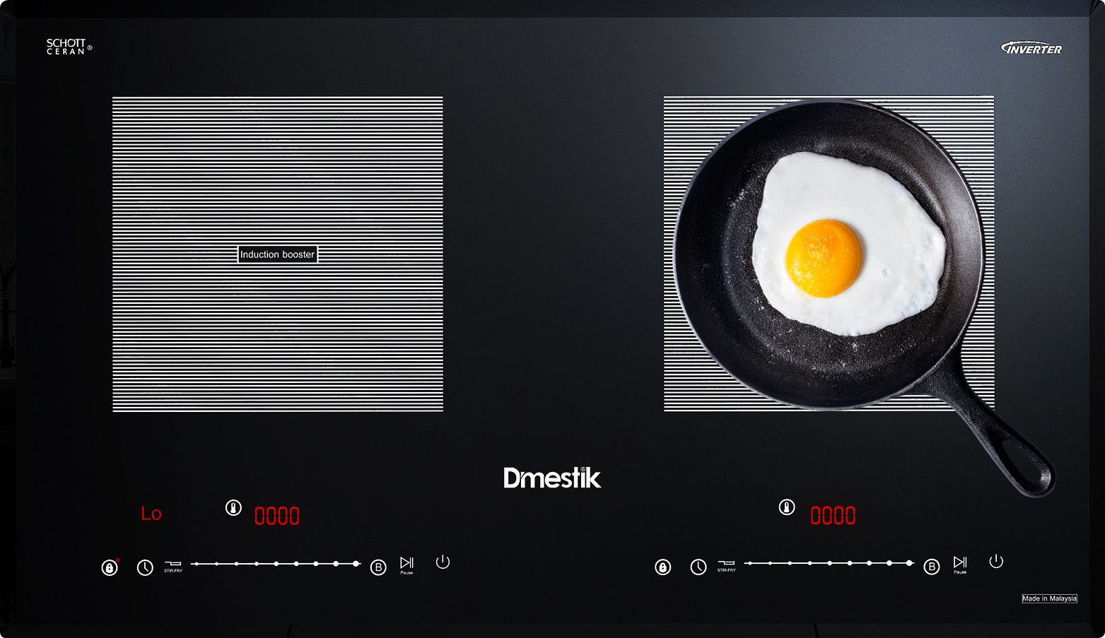 Bếp từ D'mestik được điều khiển bằng bảng điều khiển cảm ứng dạng thanh trượt Slider vô cùng dễ thao tác. Mỗi một vùng nấu sẽ là một bảng điều khiển riêng cho phép bạn gia nhiệt độc lập tiện lợi. Hiện bếp có 9 mức điều chỉnh nhiệt và chế độ nấu nhanh Booster tại hai vùng nấu.